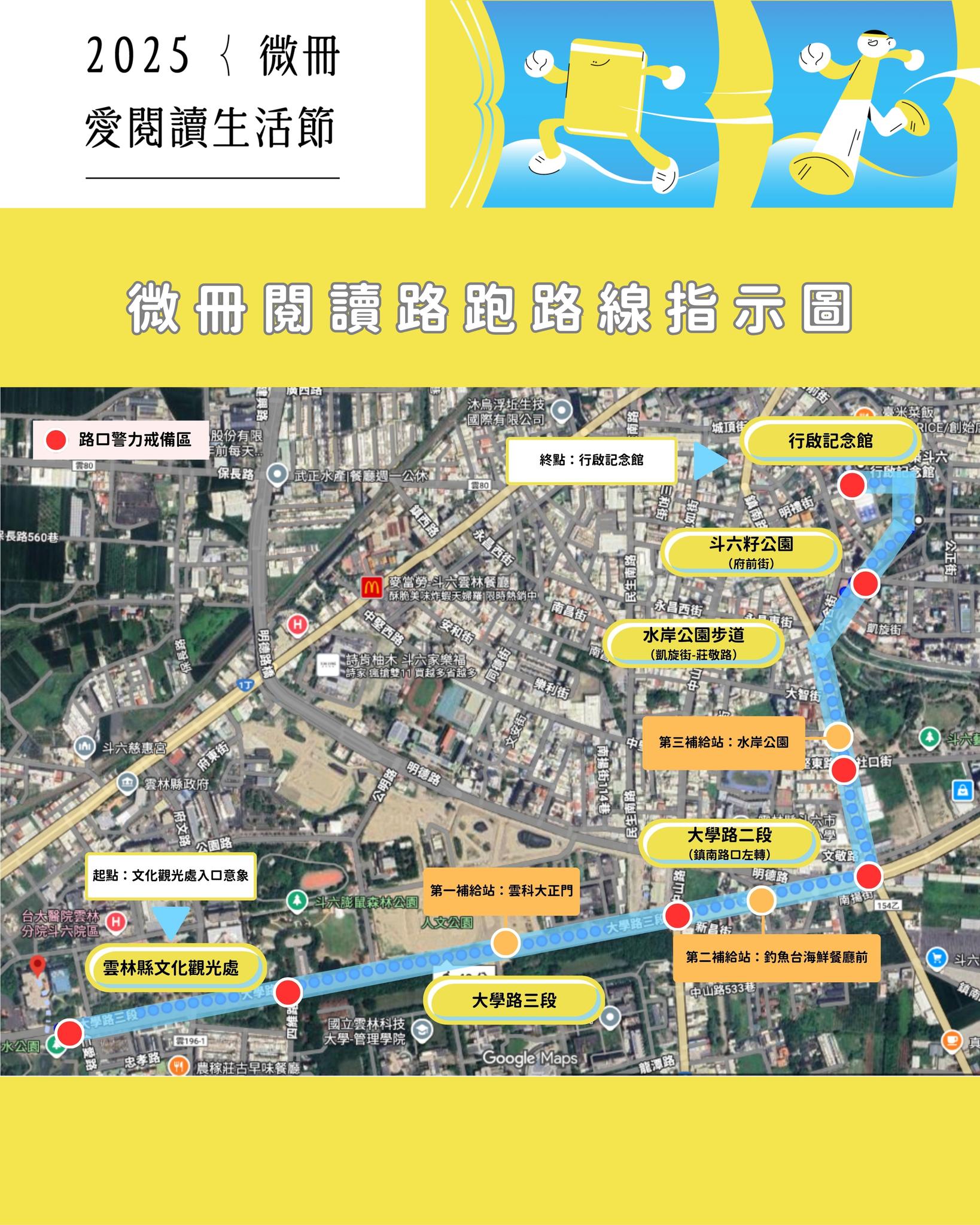路跑路線:文化觀光處 → 大學路三段 → 大學路二段 →水岸公園步道 → 雲林溪人行步道 → 斗六籽公園 → 行啟記念館(終點)